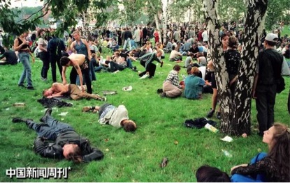 1999年5月5日,一群俄罗斯人在红辣椒音乐会门外醉酒到不省人事,音乐会就在著名的莫斯科红场附近。图/IC