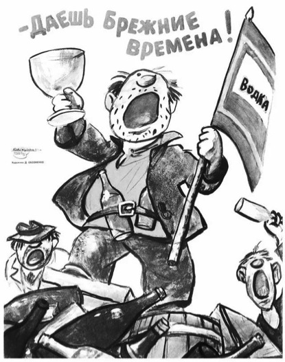 “回到勃列日涅夫的美好时代!”旗帜上的字就是伏特加,这幅1989年的海报创作时正值苏联限制烈酒政策推行期间。