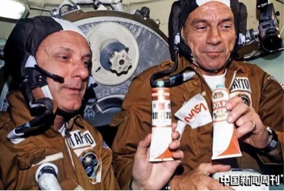 宇航员Thomas P. Stafford (左)和Donald K. Deke Slayton在执行一项任务时,在联盟号飞船轨道舱内展示装有苏联食品的食物容器。容器上原本标有伏特加的标签被罗宋汤的贴纸覆盖,据称这是宇航员们互相敬酒的方式。图/IC