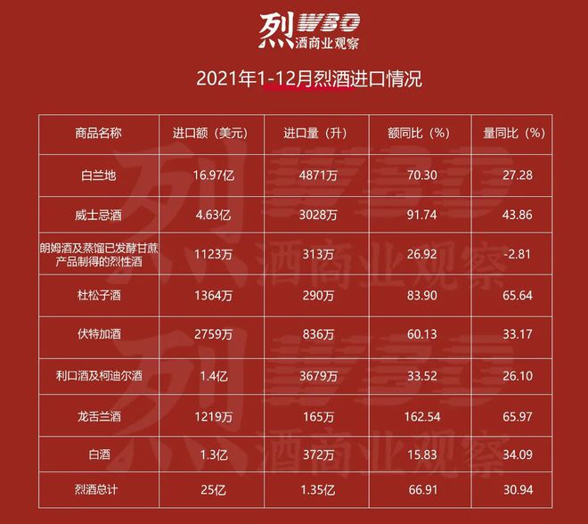 尽管进口量额的增幅排名榜首,但从绝对数量和绝对金额来看,龙舌兰酒是不折不扣的小弟,因此这个高增长是建立在低起点基础上的。