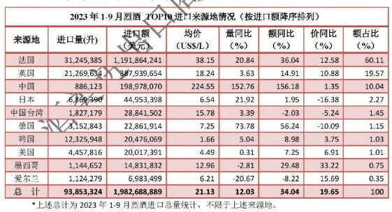 前三季度,烈酒量额延续较强增势,市占率再攀新高。进口量9385万升,增长12%;进口额19.8亿美元,增长34%。