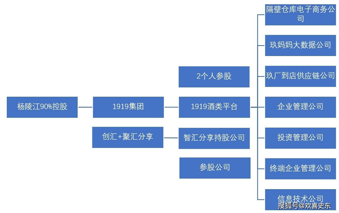 组织总体按3层架构搭建,1973年出生的杨陵江直接持有公司2.34%的股份,并持有公司控股股东壹玖壹玖集团有限公司90.46%的股权,任上市公司董事长兼总经理,是公司实际控制人。2018年获阿里20亿战略投资,股份占比28%。
