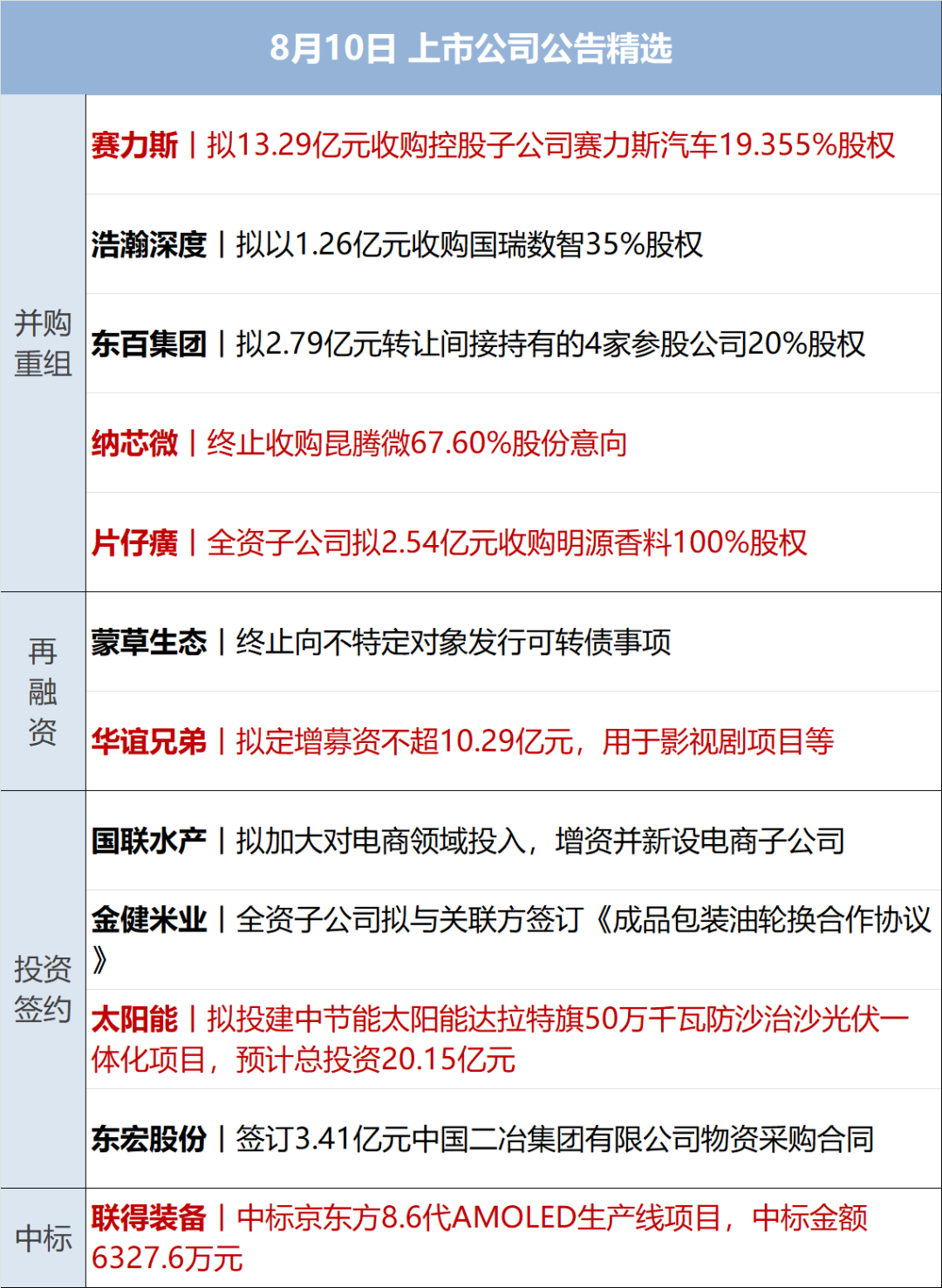 NO.1 隔夜市场 美股三大指数集体收涨,道指涨0.13%,本周累计下跌0.6%;纳指涨0.51%,本周累计下跌0.18%;标普500指数涨0.47%,本周累计下跌0.04%;热门科技股多数上涨,苹果、谷歌、特斯拉、Meta涨超1%;芯片股多数下跌,英特尔跌超3%,阿斯麦、超威半导体、恩智浦半导体跌超1%,高通跌0.28%,英伟达跌0.21%。中概股多数下跌,纳斯达克中国金龙指数跌0.96%,本周累计上涨3.61%。哔哩哔哩跌5%,腾讯音乐跌超4%,小鹏汽车跌超2%,百度、满帮、爱奇艺、唯品会、蔚来跌超1%,富途控股、京东、阿里巴巴小幅下跌;理想汽车、网易小幅上涨。 国际油价集体上涨,美油9月合约涨1.04%,报76.98美元/桶,周涨3.83%;布油10月合约涨0.67%,报79.69美元/桶,周涨3.75%。 欧股主要指数收盘普涨,德国DAX30指数涨0.26%,英国富时100指数涨0.3%,法国CAC40指数涨0.3%。 NO.2 国家金融监督管理总局发布关于加强和改进互联网财产保险业务监管有关事项的通知 8月9日,国家金融监督管理总局发布关于加强和改进互联网财产保险业务监管有关事项的通知。互联网保险公司之外的财产保险公司开展互联网财产保险业务,应符合以下条件:(一)最近连续四个季度综合偿付能力充足率不低于120%,核心偿付能力充足率不低于75%;(二)最近连续四个季度风险综合评级为B类及以上;(三)金融监管总局规定的其他条件。互联网保险公司开展互联网财产保险业务,应符合《互联网保险业务监管办法》有关条件,且上季度末偿付能力、风险综合评级满足前款要求的指标。(国家金融监督管理总局网站) NO.3 央行发布2024年第二季度中国货币政策执行报告 8月9日,央行发布2024年第二季度中国货币政策执行报告,下阶段,中国人民银行将坚持稳中求进工作总基调,完整、准确、全面贯彻新发展理念,坚定不移走中国特色金融发展之路,加快建设金融强国,推动金融高质量发展,深化金融体制改革,加快完善中央银行制度,推进货币政策框架转型。稳健的货币政策要注重平衡好短期和长期、稳增长和防风险、内部均衡和外部均衡的关系,增强宏观政策取向一致性,加强逆周期调节,增强经济持续回升向好态势,为完成全年经济社会发展目标任务营造良好的货币金融环境。(中国人民银行网站) NO.4商务部新闻发言人就中方在世贸组织起诉欧盟电动汽车临时反补贴措施答记者问 8月9日,商务部新闻发言人就中方在世贸组织起诉欧盟电动汽车临时反补贴措施答记者问。问:据悉,中国就欧盟电动汽车临时反补贴措施在世贸组织提起诉讼。能否请您介绍具体情况?答:为维护电动汽车产业发展权益和全球绿色转型合作,8月9日,中国将欧盟电动汽车临时反补贴措施诉诸世界贸易组织争端解决机制。欧盟初裁中的认定缺乏事实和法律基础,严重违反世贸组织规则,损害全球应对气候变化合作大局。我们敦促欧盟立即纠正错误做法,共同维护中欧经贸合作和电动汽车产业链供应链稳定。(商务部网站) NO.5 外交部回应日本抓扣中国台湾渔船 外交部发言人就近期日本抓扣台湾渔船答记者问。问:据报道,近日台湾“福洋266号”渔船、“富申号”渔船相继被日本公务船以违反渔业法规为由抓扣,在缴纳罚款后获释。台湾当局认为有关渔船违反日本渔业法规。请问中方对此有何评论?答:中国政府高度重视维护包括台湾地区在内的中国渔民合法利益。根据《中日渔业协定》,日方无权在有关水域对中方渔船采取执法措施。中方已向日方提出严正交涉,要求其立即纠正错误做法,并采取有效措施防止类似事件再次发生。(外交部网站) NO.6 证监会:未来资本市场改革需要更加重视投融资两端的平衡 《中央关于进一步全面深化改革、推进中国式现代化的决定》近日发布,对进一步深化资本市场改革进行部署,作出“健全投资和融资相协调的资本市场功能”“促进资本市场健康稳定发展”“建立增强资本市场内在稳定性长效机制”等安排。证监会市场一司司长张望军说:“‘健全投资和融资相协调的资本市场功能’在《决定》中首次提出,这体现了新形势下中央对资本市场定位、功能、作用的新期待和新要求。未来资本市场改革需要更加重视投融资两端的平衡。”(新华社) NO.7 三部门:进一步调整新增建设用地土地有偿使用费缴费方式 自然资源部、财政部、中国人民银行发布关于调整新增建设用地土地有偿使用费缴费方式的补充通知。在优化单独选址建设项目用地审批流程和精简审查内容的基础上,进一步调整新增建设用地土地有偿使用费缴费方式。其中提出,对报国务院批准农用地转用的,自然资源部不再下发新增建设用地有偿使用费缴费通知单。省(自治区、直辖市、计划单列市,下同)级自然资源主管部门收到用地批准文件后,开具《新增建设用地土地有偿使用费缴款通知书》,通知申请办理新增建设用地审批手续的市、县人民政府在规定的时间内依法足额缴纳新增建设用地土地有偿使用费,同时将缴款通知书抄送财政部各地监管局以及省级财政部门备查。省级自然资源主管部门应当在收到市、县人民政府已足额缴纳新增建设用地土地有偿使用费的有效凭证后,再依法办理后续用地等手续。(自然资源部网站) NO.8 北京检察机关依法对中植企业集团原董事局主席高某某等49人提起公诉 8月9日,北京市公安局朝阳分局以中植企业集团有限公司原董事局主席高某某等49名犯罪嫌疑人涉嫌非