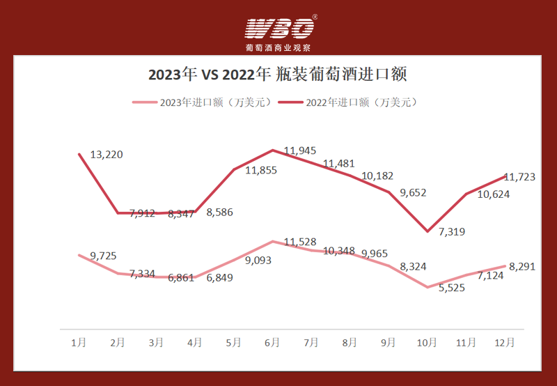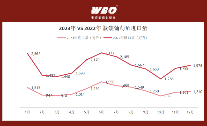 拉通2023年全年来看,1-12月每月的葡萄酒进口量、额均低于2022年,其中1月差额最大,为1047.12万升,主要由于1月数据反映的是2022年12月甚至更早的合同签订情况,而该时间处于疫情爆发高峰期,葡萄酒商业活动大量停滞,因此进口商下单量会有明显下滑。