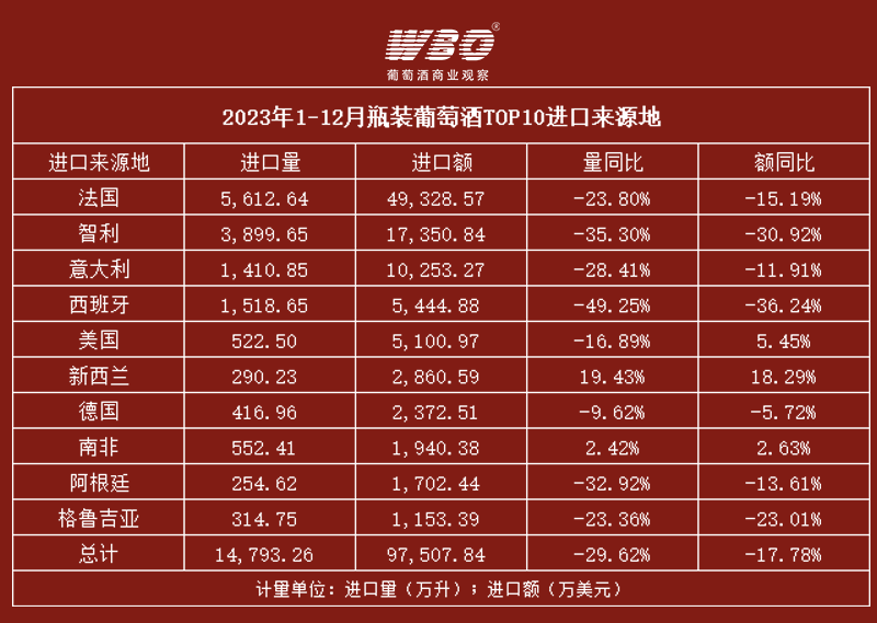 数据显示,2023年1-12月瓶装葡萄酒进口量约为1.55亿升,进口额约为10.1亿美元(约合人民币72.68亿元),量额同比分别下跌29.54%、17.81%。