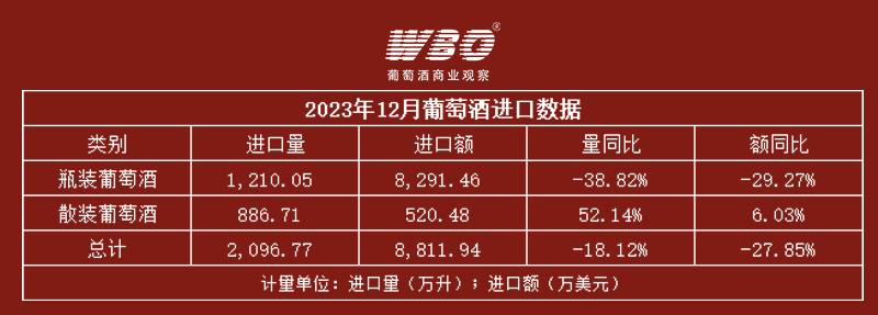 近日,中国海关发布了2023年1-12月的葡萄酒进口数据。整体来看,2023年葡萄酒进口量约为2.43亿升,进口额约为10.82亿美元(约合人民币77.86亿元)。进口量、额同比分别下滑25.67%、19.41%。值得注意的是,自10月开始,进口数据环比呈现稳定的反弹趋势,也为2024年注入了信心。