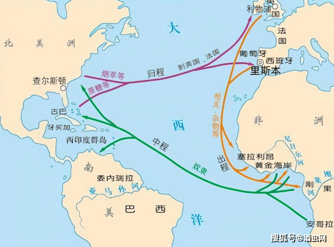 在大西洋上的三角形路线的环流影响下,正好形成一个从欧洲出发到非洲和美洲的航线,恰好构成了三角形的循环贸易。