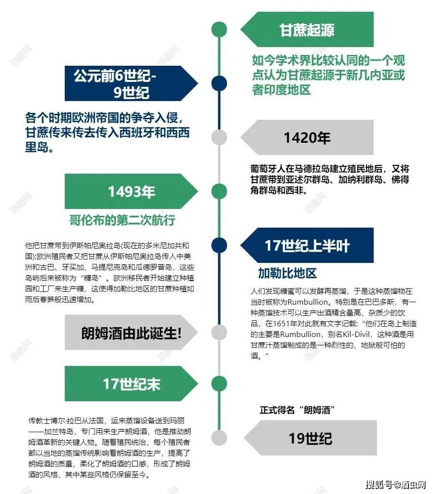 这又得简单普及一下甘蔗历史。甘蔗起源是一个具有争议的话题,如今学术界比较认同的一个观点认为甘蔗起源于新几内亚或者印度地区。从公元前6世纪到9世纪,各个时期欧洲帝国的争夺入侵,甘蔗传来传去传入西班牙和西西里岛。再由哥伦比亚的第二次航行带入伊斯帕尼奥拉岛,最后于加勒比海地区诞生最初的朗姆酒。其时间轴如下图: