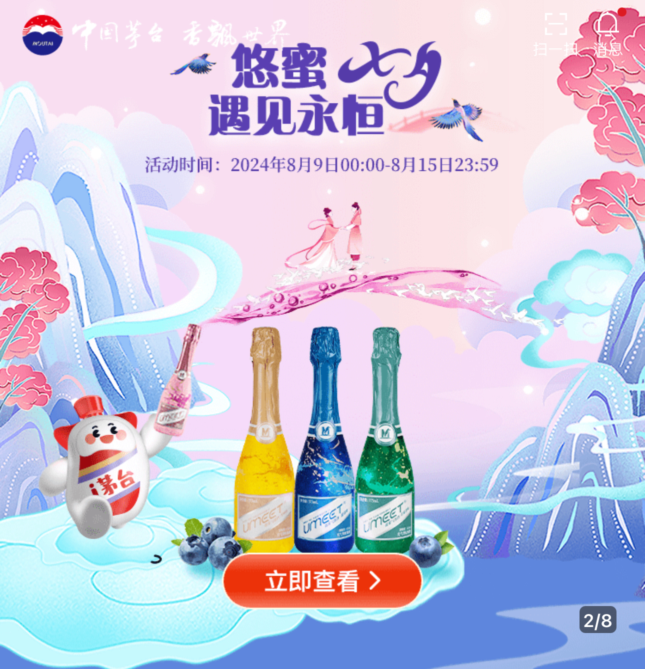 七夕佳节即将到来之际,时尚高端低度酒又迎来新选择!8月9日,茅台生态农业公司UMEET蓝莓气泡酒“玫瑰荔枝味”新品在i茅台全网首发,同步启动“悠逢七夕 蜜恋永恒”新品首发活动,满足条件的消费者还可获赠浪漫好礼,茅台生态农业公司UMEET蓝莓气泡酒与你共庆美好七夕。