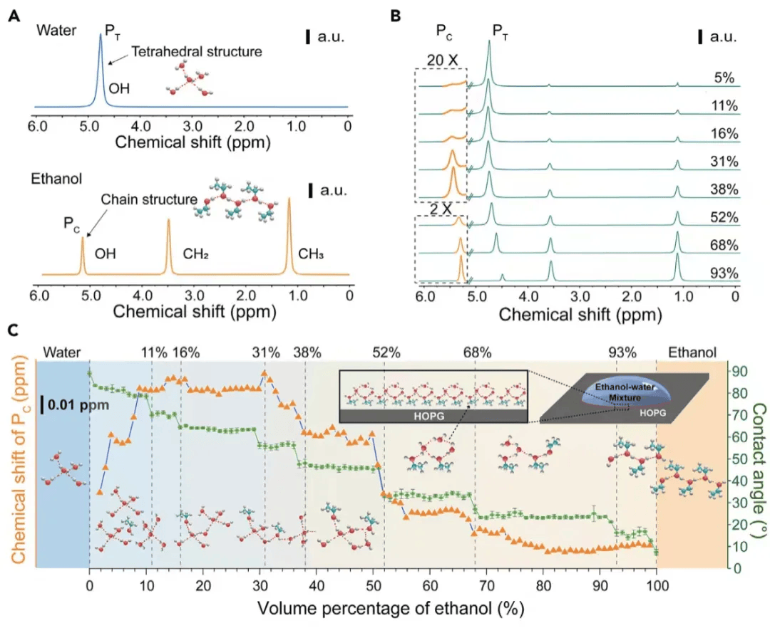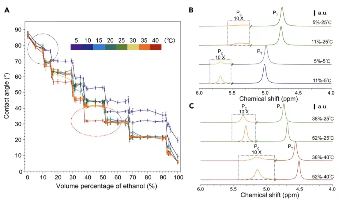 ▎上图展示了通过接触角和变温核磁探究了温度变化对乙醇水团簇及对应表面张力的影响