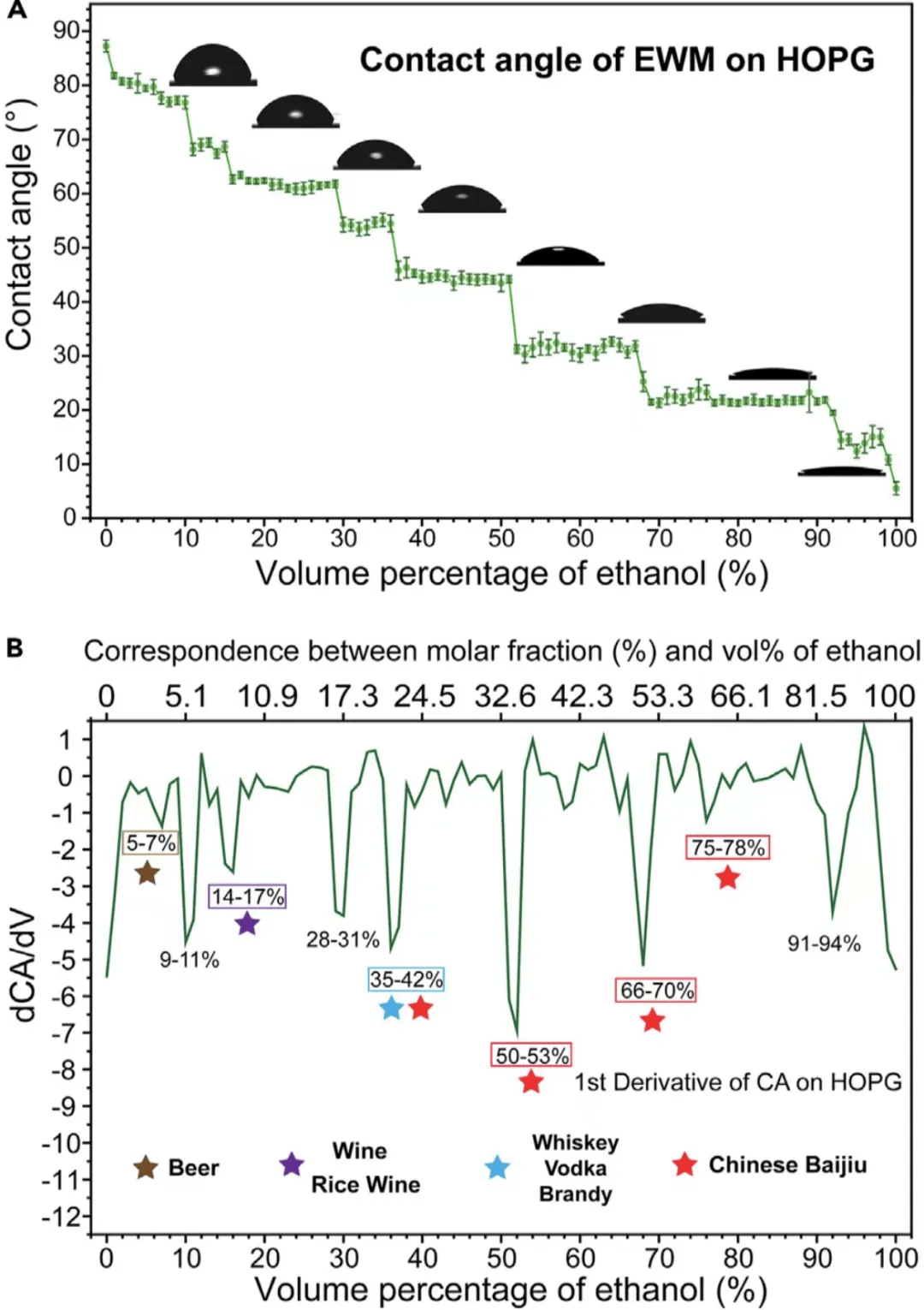 ▎上图展示了乙醇-水混合物在疏水表面上的接触角测试,其变化趋势与全球著名酒精饮料的度数分布相吻合