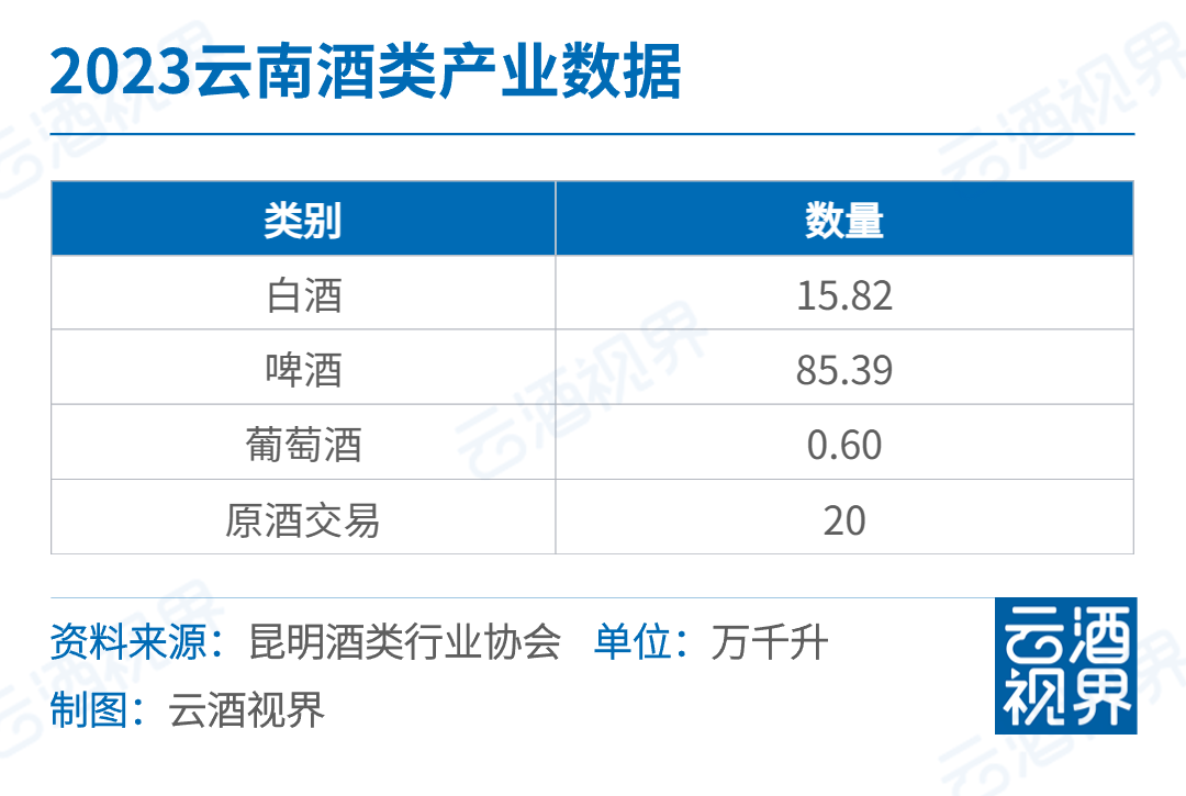 近日,云南酒类产业数据出炉,2023年,云南规模以上企业的白酒产量(折65度)达15.82万千升、啤酒85.39万千升、葡萄酒0.60万千升;同期,原酒交易超20万千升。(昆明酒类行业协会)