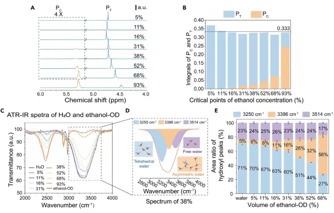 ▎上图展示了1H NMR光谱和MD模拟揭示了乙醇水溶液中不同乙醇-水分子团簇的存在