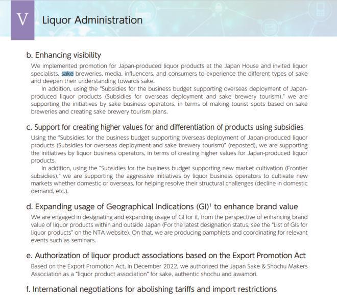 其实在日本国税厅发布的文件中就有关于日本清酒的“升值”手段。日本通过推广宣传活动扩大清酒的知名度,而且日本大力支持和补贴日本清酒创造价值化和差异化,其中就包括提升品牌的价值,即将酒文化价值赋予到酒的品牌中,从而打造出特有的日本清酒品牌。