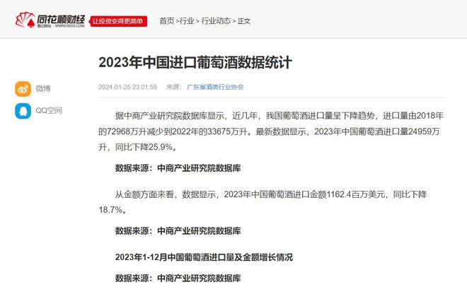 我国对于葡萄酒的进口量一直很高,特别是中产对于葡萄酒在商业上的价值需求更大,虽然近年来我国对于国外葡萄酒的进口量有所降低,但是根据同花顺财经文章中,广东酒类行业协会指出:2023年我国葡萄酒进口金额超11亿美元!