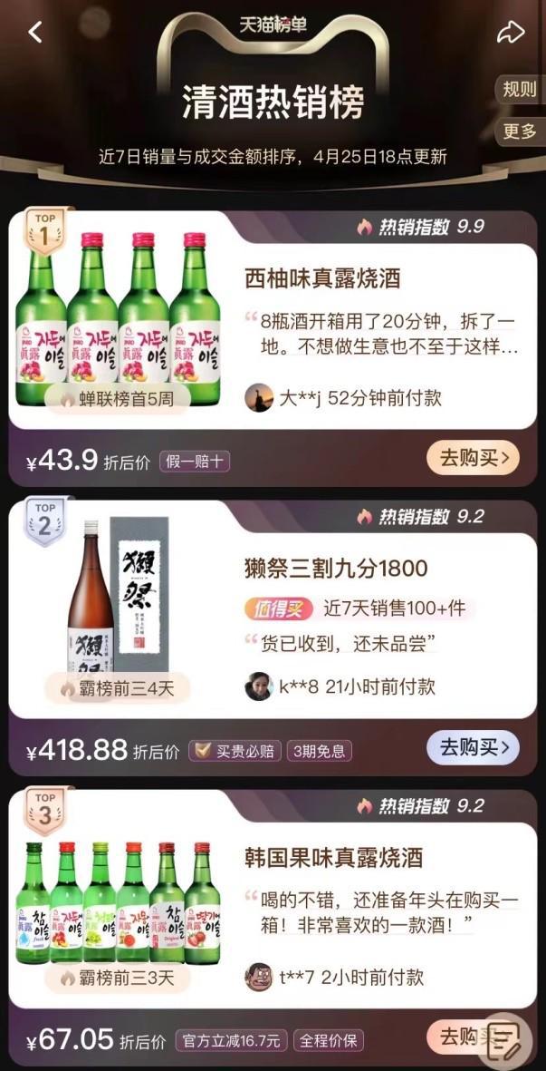 除了葡萄酒之外,韩国的烧酒凭借着辛辣的口感和价格低廉的优势,在电商平台中成功超过了日本清酒成为热销榜第一,可以看出,韩国烧酒在我国酒业消费市场中的销量和影响力是潜移默化的,虽然不似其他国外酒高价品质,但价格实惠确实也打开了新的销量。