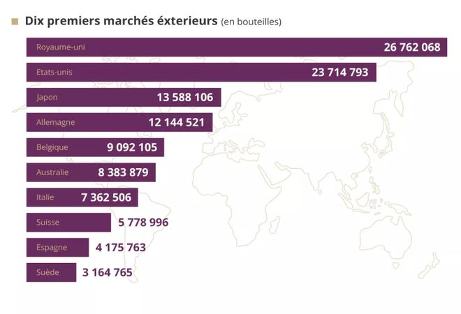 2018年,法国葡萄酒和烈酒出口额达到创纪录的132亿欧元(+2.4%),是法国对外贸易中仅次于航空业的第二大顺差。