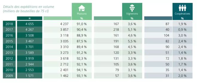也就是说,150个酒商共出口了423.7万瓶香槟,平均每家酒商出口2.83万瓶;182家酒农共出口中国16.7万瓶香槟,平均每家酒农出口917瓶;25家合作社共出口中国8.7万瓶香槟,平均每家合作社出口 3470瓶;