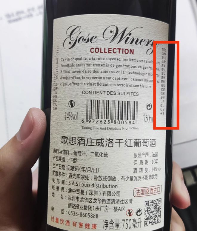 另外一款酒,则在背标的设计上做足了文章,在产品信息部分,可以明显看到委托商、经销商等信息,但生产商及生产地址被放到了酒标右上侧,以非常小的字体k8凯发国际官方入口竖排排列,很难发现。《食品安全国家标准 预包装食品标签通则》(GB 7718-2011)在基本要求3.4中,规定“应真实、准确,不得以虚假、夸大、使消费者误解或欺骗性的文字、图形等方式介绍食品,也不得利用字号大小或色差误导消费者”。该款酒标的标签则存在误导的嫌疑。