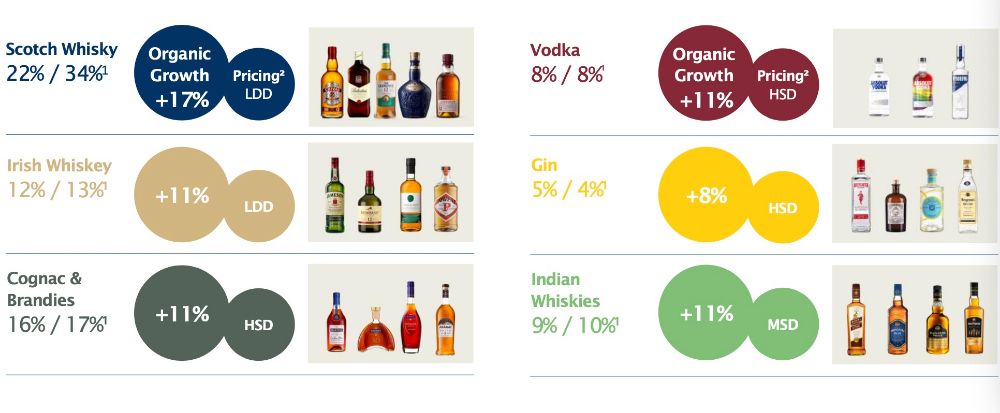 (2023财年保乐力加的威士忌、伏特加、白兰地都实现了两位数增长,来自财报)