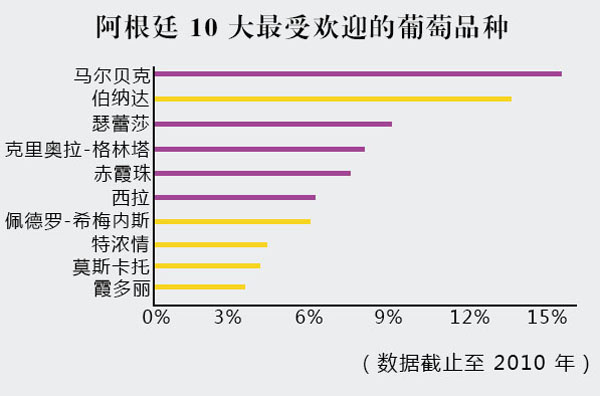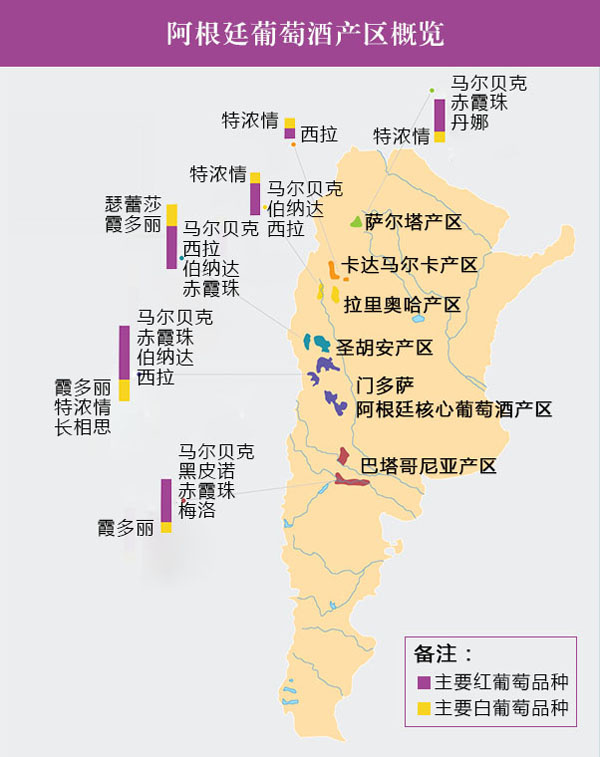 说到阿根廷葡萄酒,就不得不提起镇国之宝马尔贝克(Malbec)。不过,阿根廷可不止马尔贝克,当地知名葡萄伯纳达(Bonarda)也不再仅限于混酿品种,而且也开始逐渐走向世界。以下这张图就是阿根廷葡萄酒产区的地理分布及其主要酿酒葡萄。
