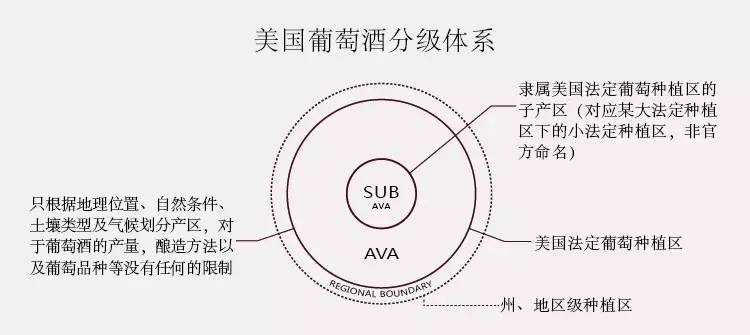 美国实质实质上没有像法国等欧洲葡萄酒产国那样严谨的分级统,目前可供参考的也就是在1983年颁布的葡萄酒产地管制条例(American Viticulture Area,简称AVA)