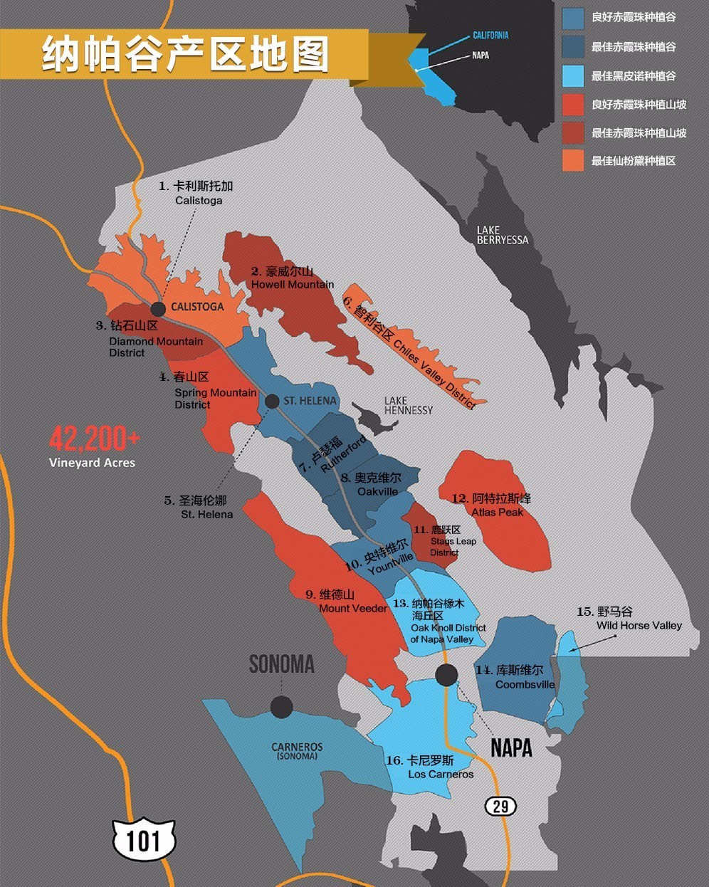美国最顶级的葡萄酒几乎都产自加州。但这并不意味着加州的酒都是好酒。但可以肯定的是,几乎每一个你听说过的葡萄品种都会在加利福尼亚有种植。