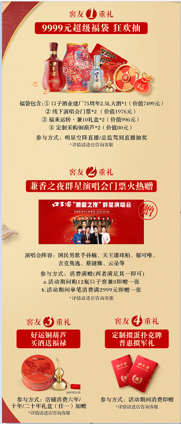 2024窖友节活动为期12天,据悉,口子窖将升级四大福利机制回馈广大窖友。