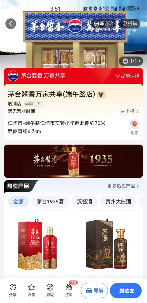 下方门店列表中点击查看带有茅台LOGO的终端门店信息,进入详情页即可查看门店详情,点击右下角“到这去”图标,即可实现精准定位、地图导航直达。