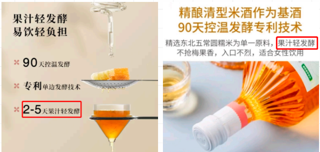 专家表示,发酵原意指水果中的糖分等物质在发酵剂的作用下转化为酒精,发酵酿造用时长,与2-5天的“轻发酵”“混合发酵”完全不同,短时间的不完全发酵,实际效果也较难判断。这样的宣称很容易使消费者将此款配制酒误认成发酵酒。